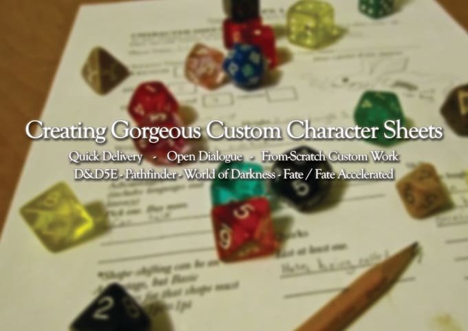 If you wish to see an example of the type of sheets that I can create, feel free to look at the gallery, and keep in mind that the sheets I create for this gig will be available for others to see in the future. NOTE: I do not create scripted/automated character sheets. I only make designs.