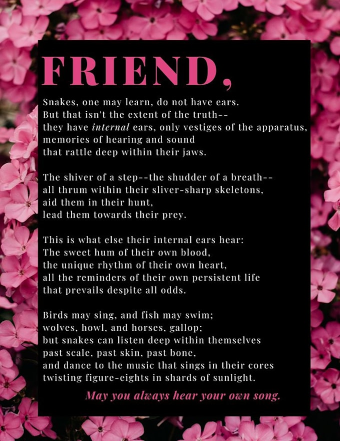 Do you need inspiration or motivation? Looking for a perfect, one-of-a-kind gift for a loved one? Let me write you a personalized inspirational poem, mounted on a beautifully designed graphic! These will be delivered in the form of a high-quality PDF, so that they can be viewed digitally or even printed out and framed!